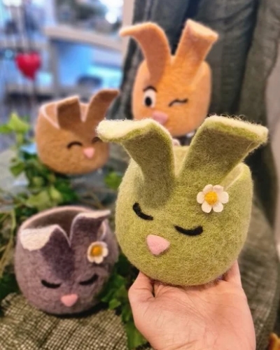 In diesem Kurs filzen wir als Einstimmung auf den Frühling lustige, farbenfrohe Körbchen in Hasenform - perfekt als Deko, Geschenk oder Osternest.