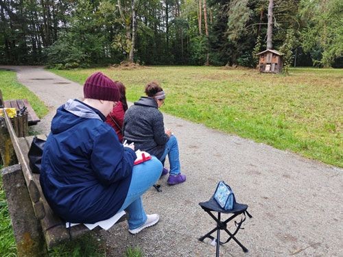 Falls Sie noch keine Skizzierausrüstung besitzen, können Sie vor Ort das „All-Inclusive-Materialpaket“ im Wert von 28,00 €, welches ein Skizzenbuch (Ringbuch Din A6) mit 150-200 g/m² Papier, einen Füller mit Tinte und einen Wassertankpinsel enthält, erwerben.